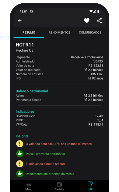 Acesse as informações de um determinado fundo e descubra detalhes sobre ele, como administrador, segmento, balanço patrimonial, P/VP, Insights. Confira também a área específica de Histórico de Rentabilidade dos Proventos e de Comunicados Oficiais.
