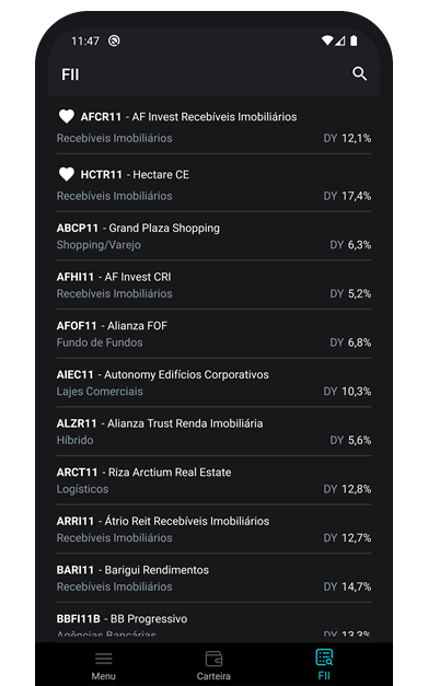 Cadastre seus Fundos Imobiliários, acompanhe sua carteira, confira em detalhes cada FII com Insights, Indicadores e muito mais.